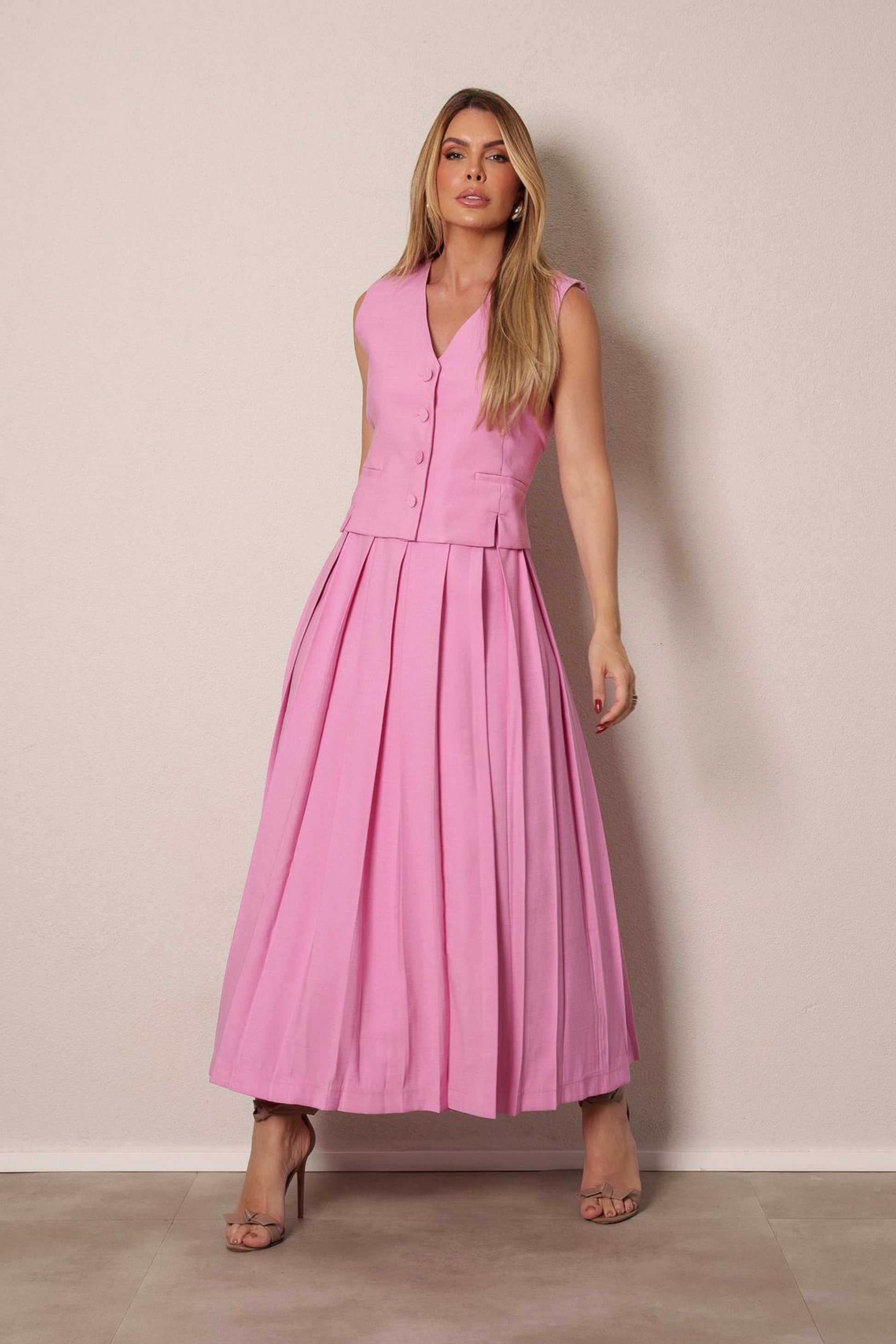 Colete de alfaiataria com botões na frente e ajuste nas costas.