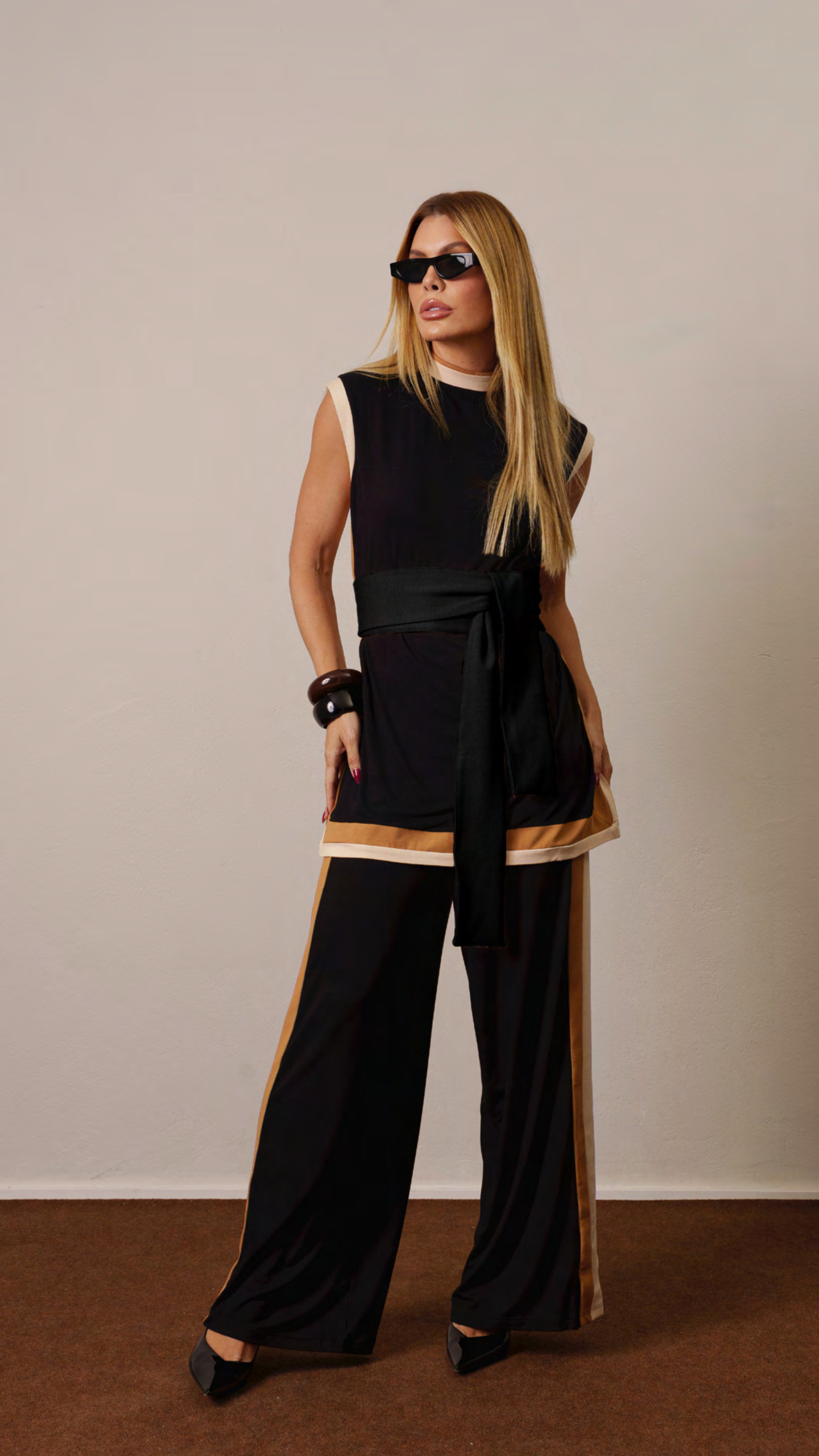 Conjunto de blusa alongada com fenda na lateral, acompanha faixa e calça pantalona com elástico no cós. Malha com viscose