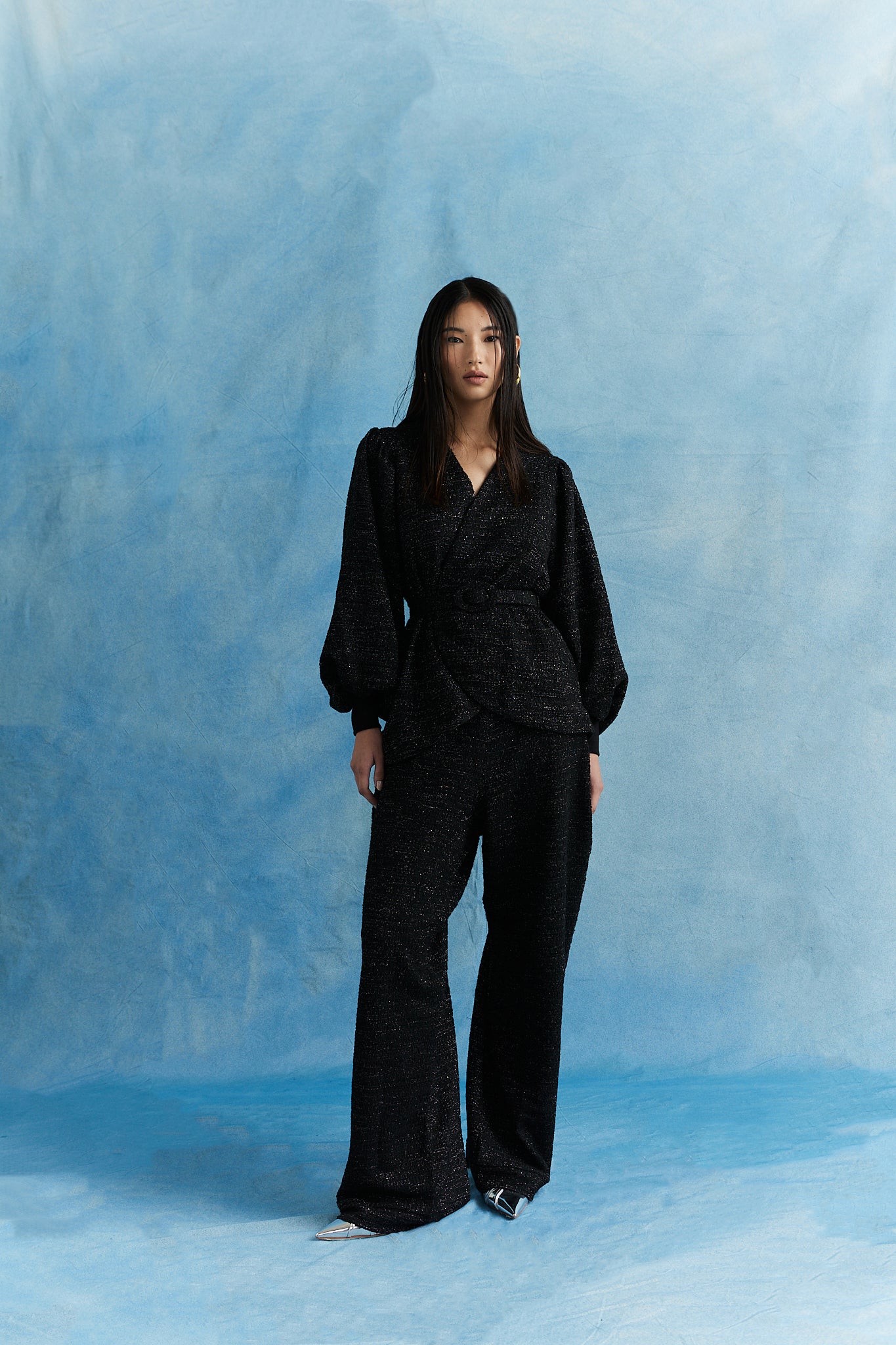 Conjunto blusa manga ampla com faixa e calça. Tecido com leve brilho