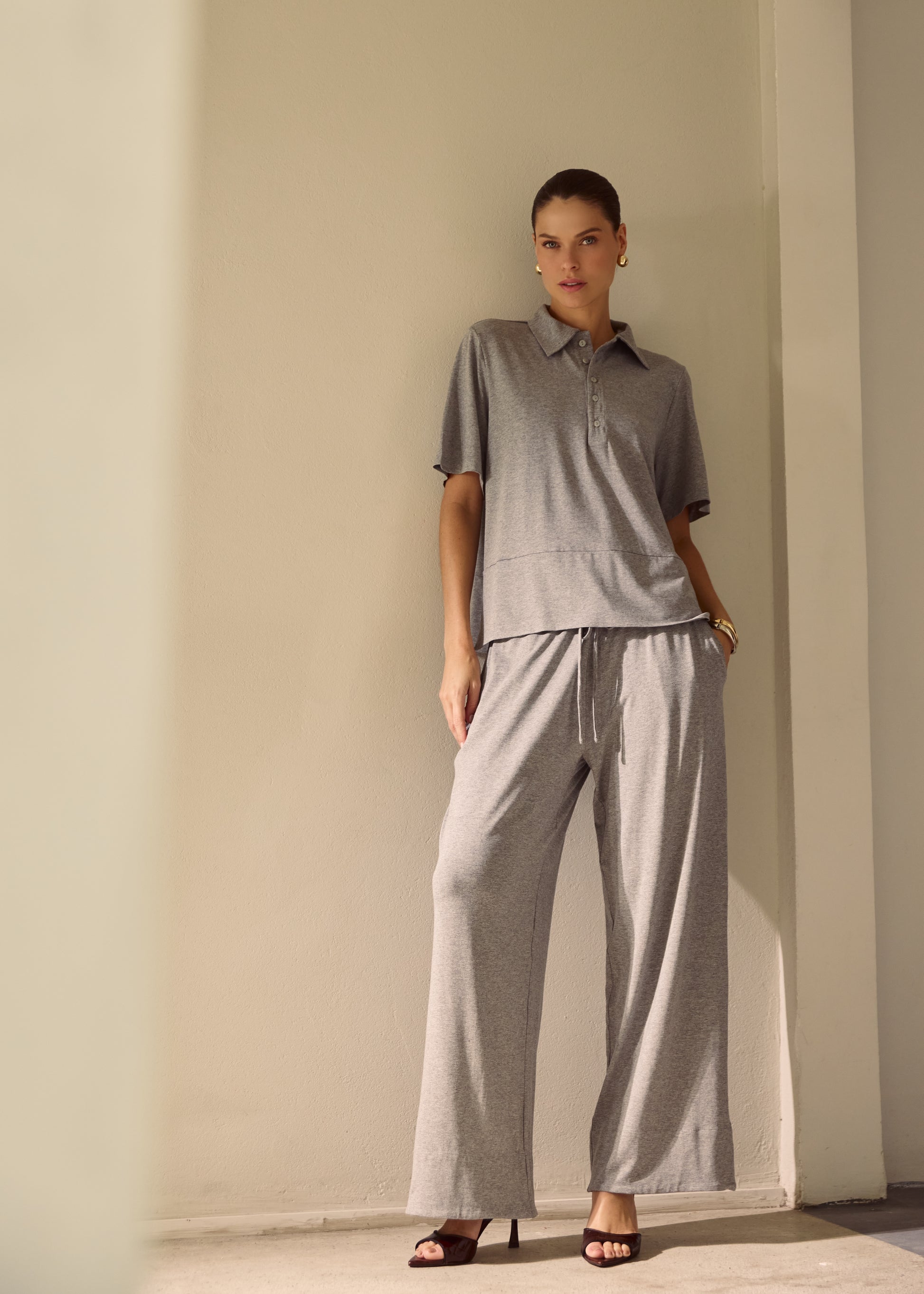 O conjunto da imagem traduz conforto sofisticado, ideal para quem busca praticidade sem abrir mão de estilo. Blusa modelo tipo polo, com gola e abotoamento discreto na frente. Calça com modelagem ampla e fluida, estilo pantalona, cintura com cós ajustável por cordão, trazendo praticidade e conforto. Em malha premium