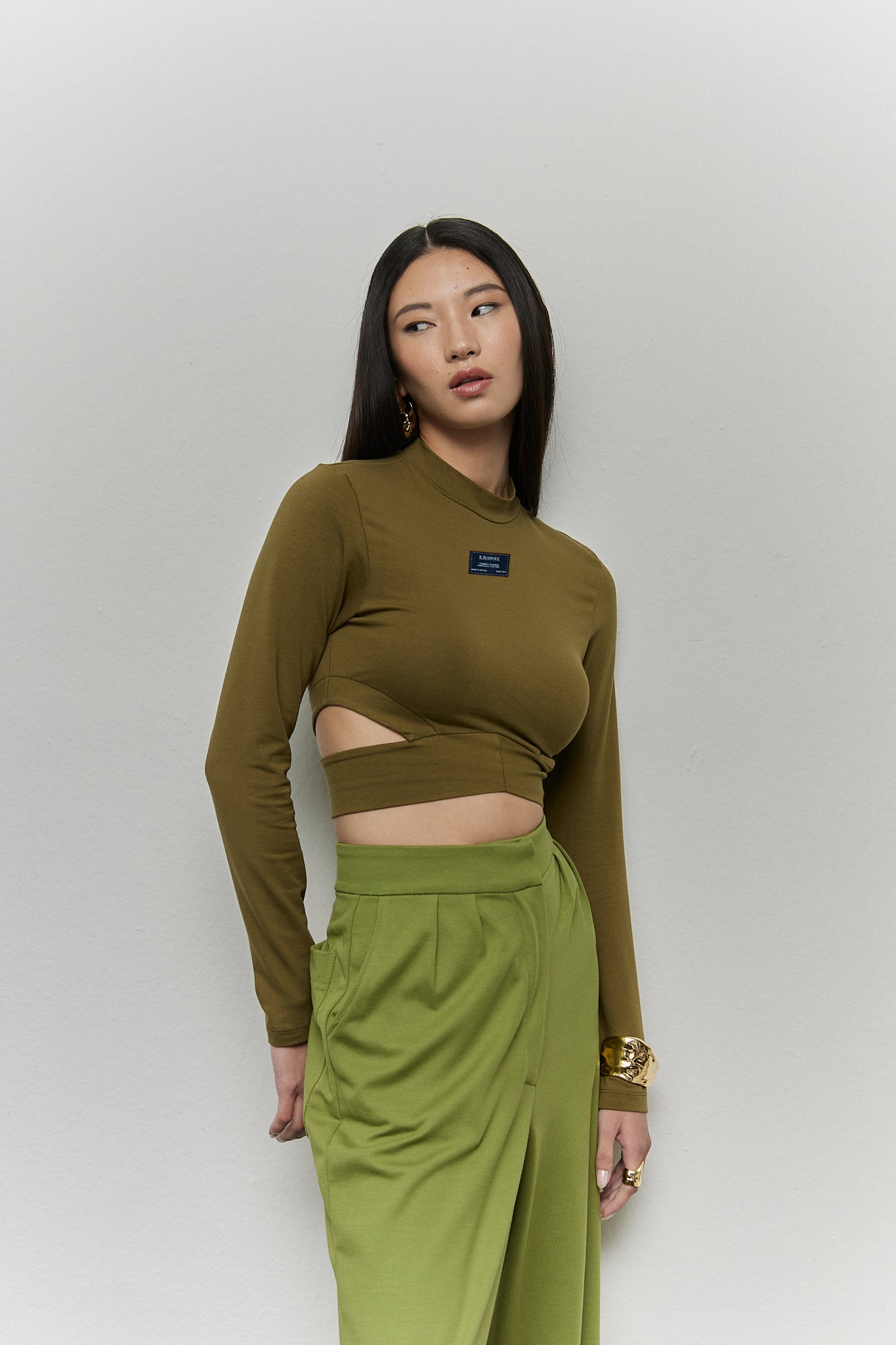 Cropped manga longa e gola alta com vazado na cintura. Confeccionado em malha.
