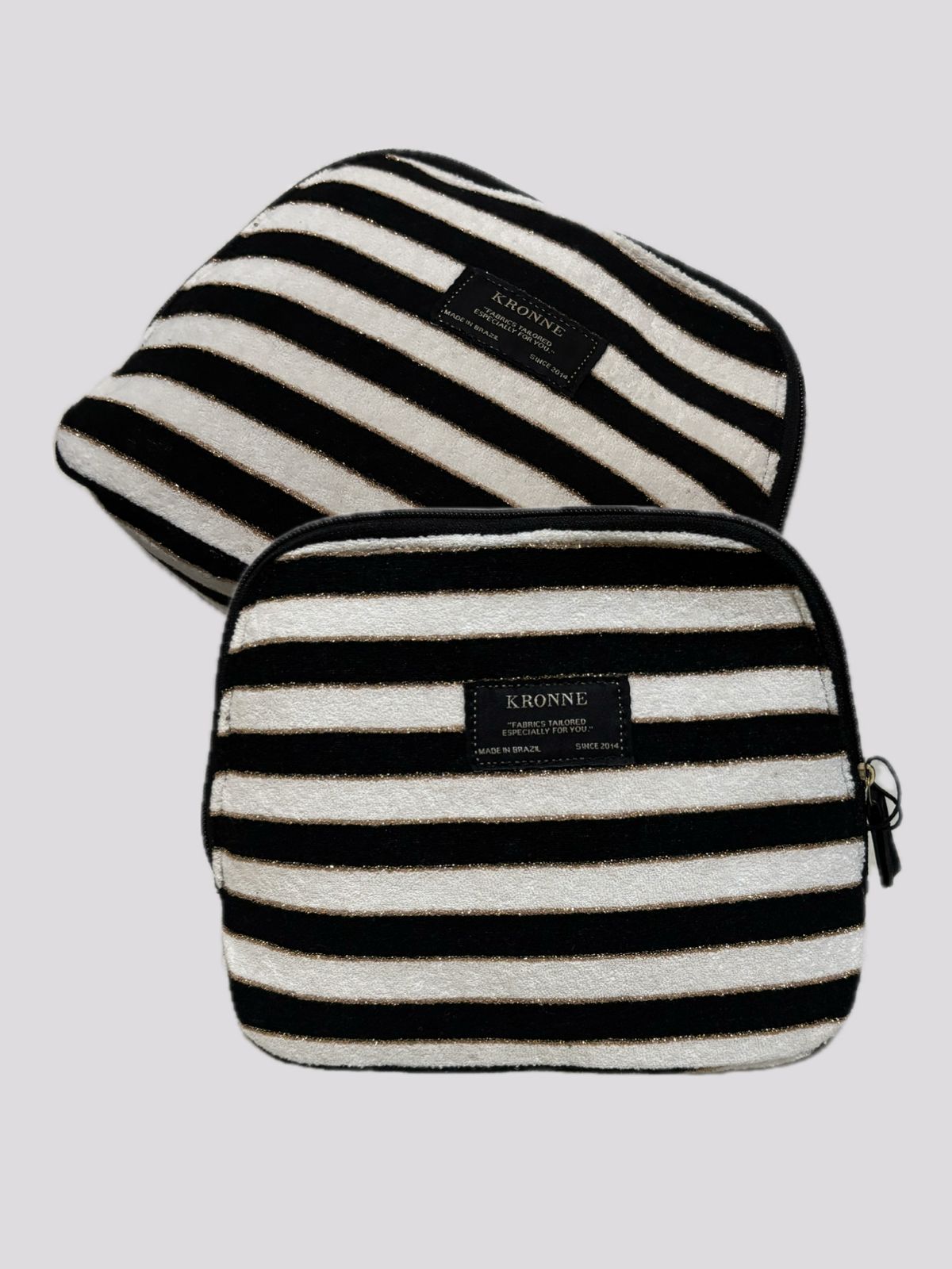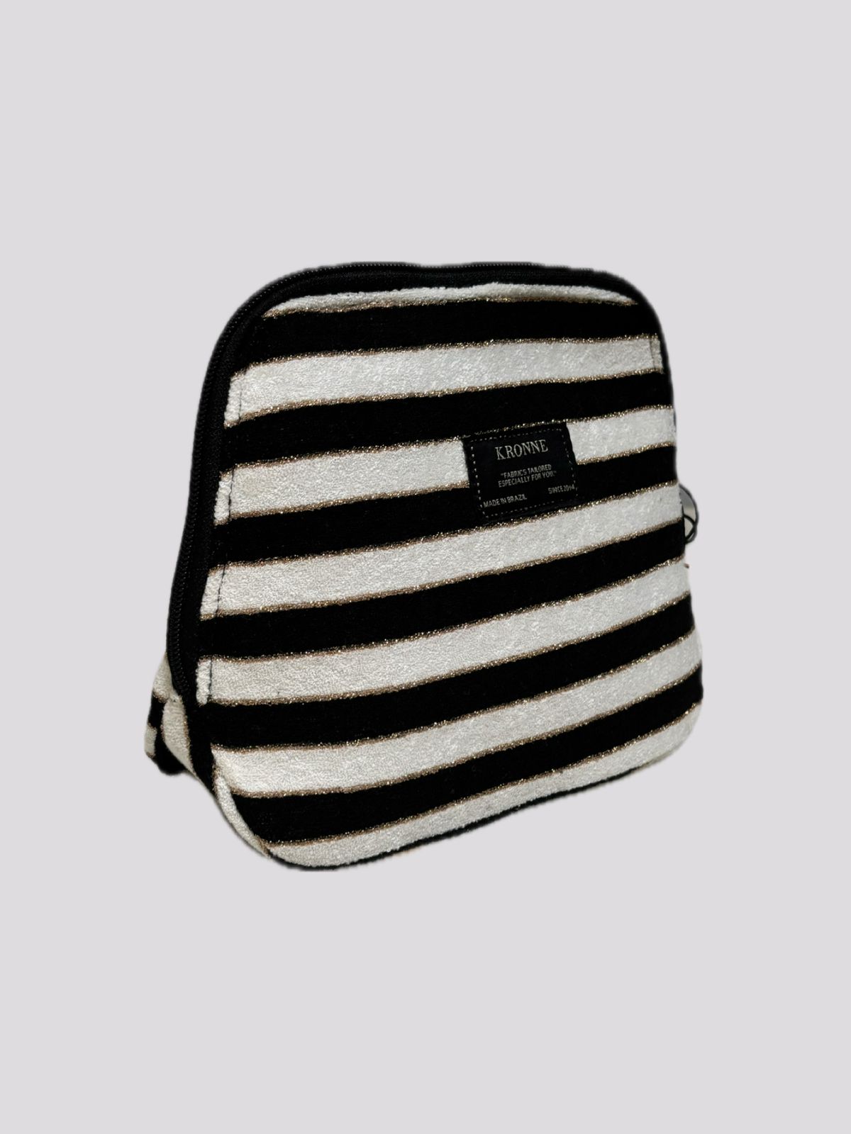 Nécessaire Kronne com tamanho médio, confeccionada em tecido atoalhado com listras e fios dourados, detalhe da etiqueta na frente. Fechamento por zíper e forro interno.