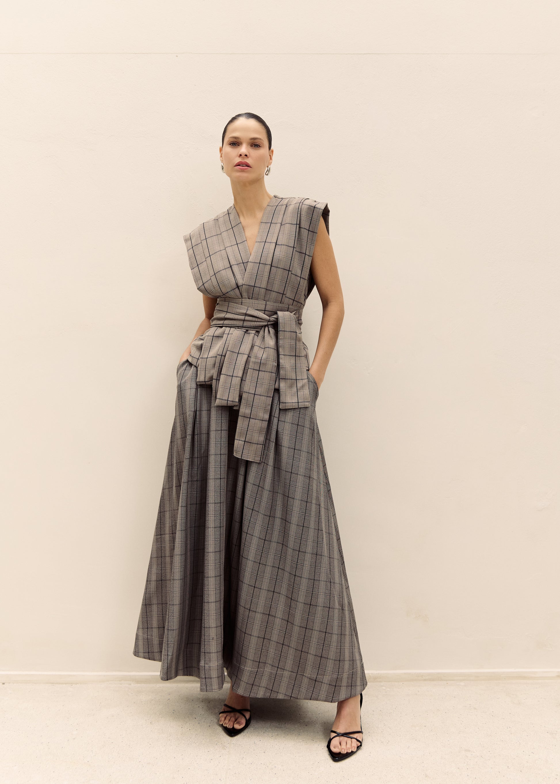 Feita em alfaiataria com fio tingido no padrão xadrez, a saia tem modelagem godê e pregas que trazem um caimento impecável. Tem acabamentos do cós pespontados.