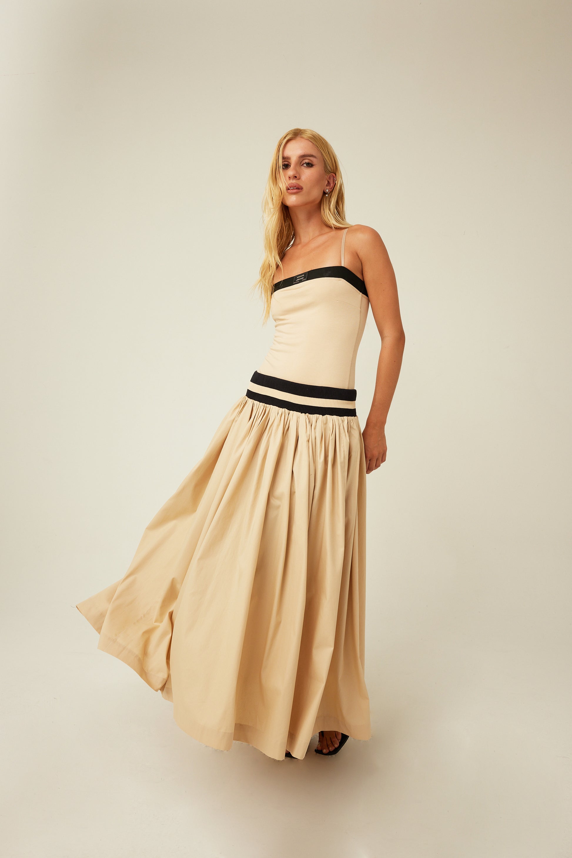 Saia longa franzida em tricoline com cós de elástico largo.
