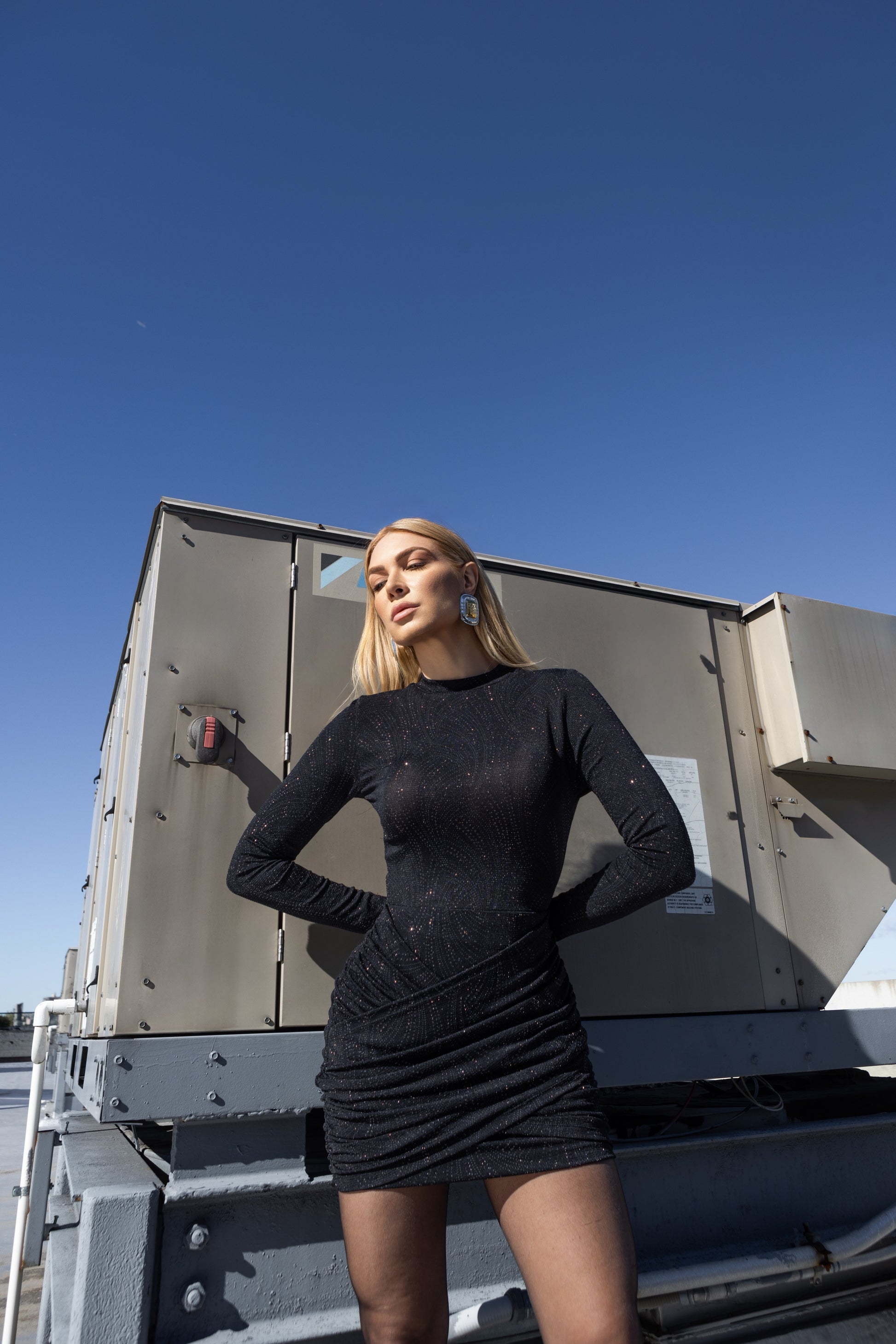 Vestido curto com manga longa e drapeado na saia, possui zíper nas cotas.