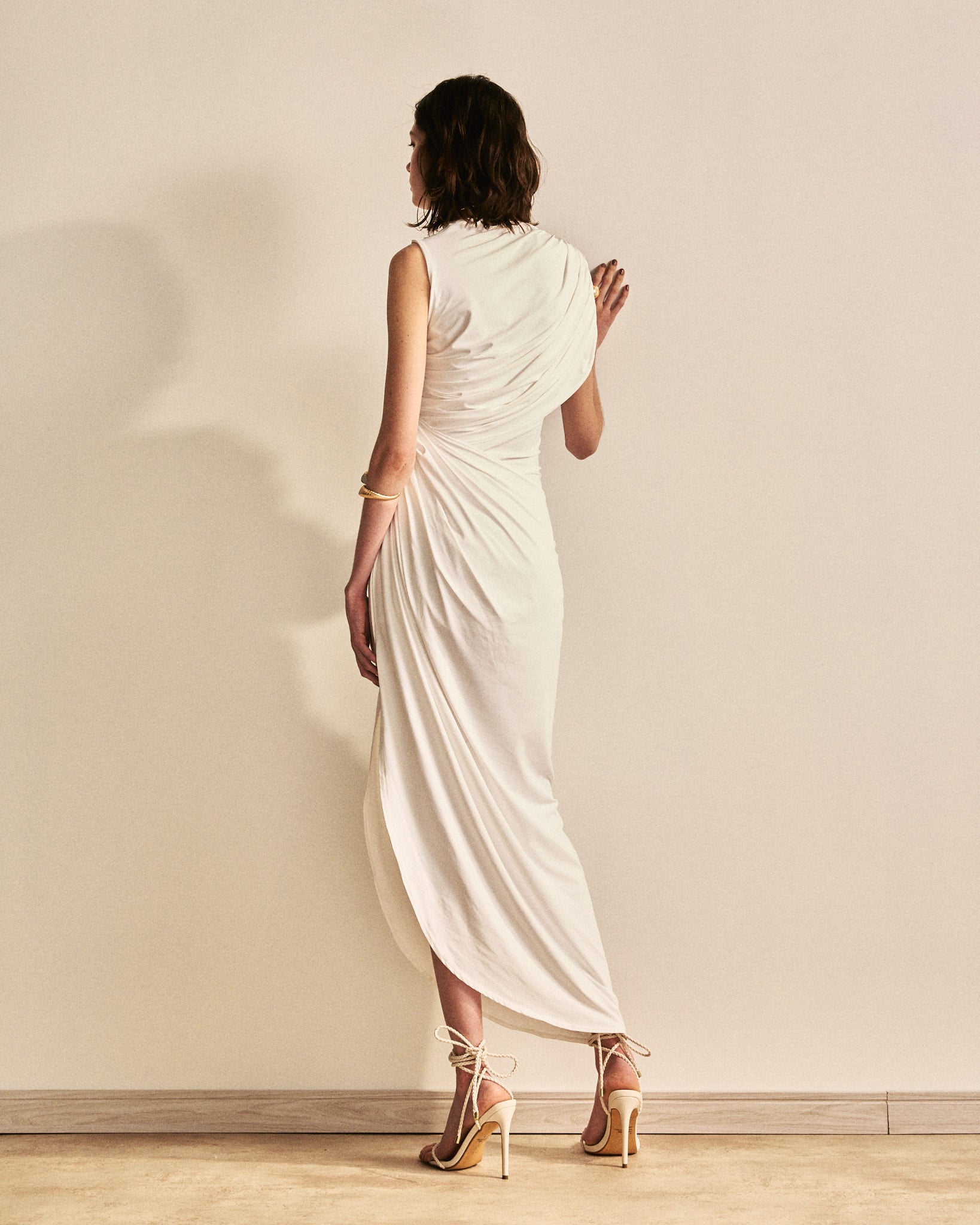 Vestido longo com design elegante e feminino. Possui gola alta e modelagem sem mangas, que alonga a silhueta com sofisticação. O destaque fica por conta do drapeado lateral, que cria um efeito assimétrico e valoriza a cintura de forma sutil.