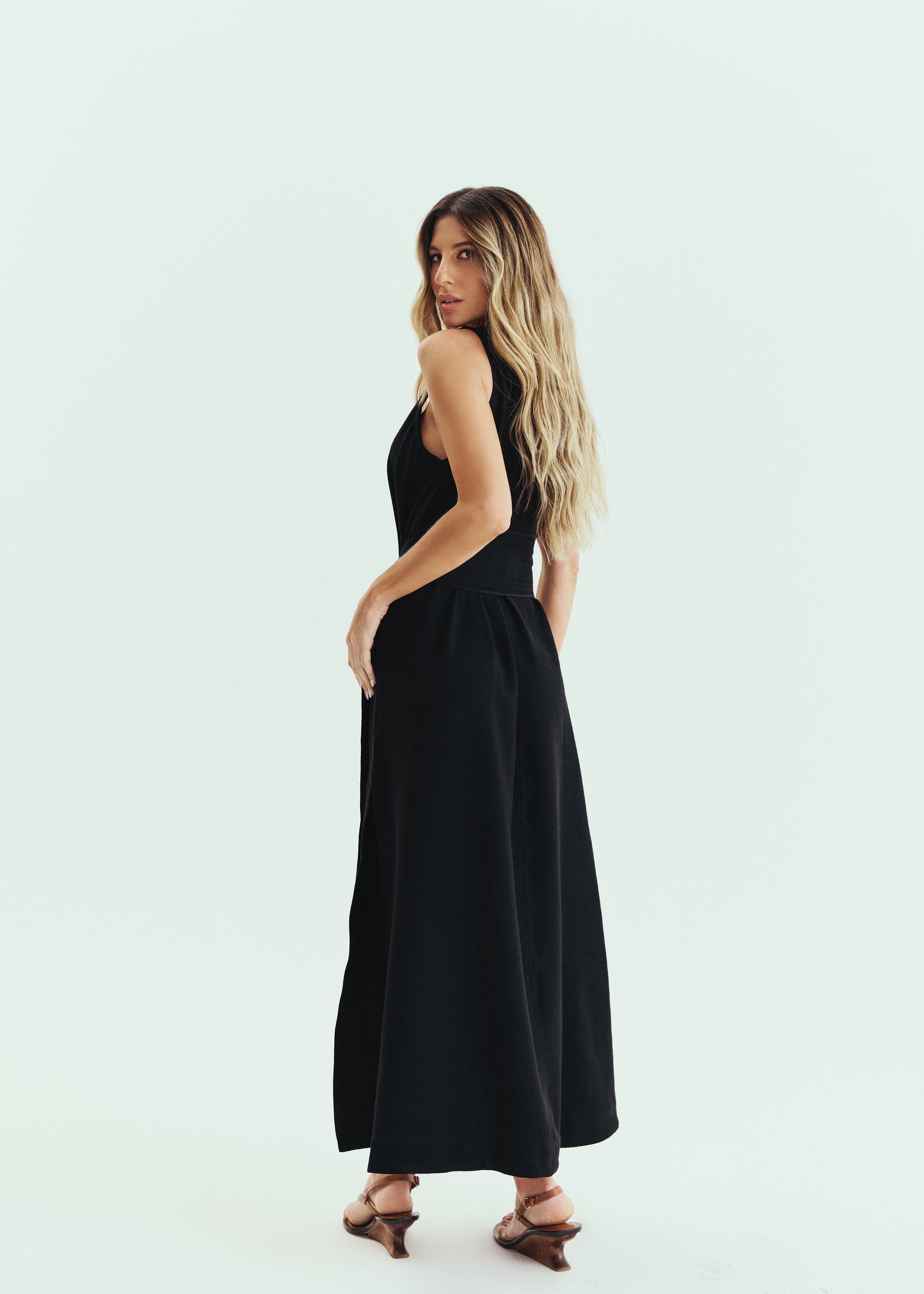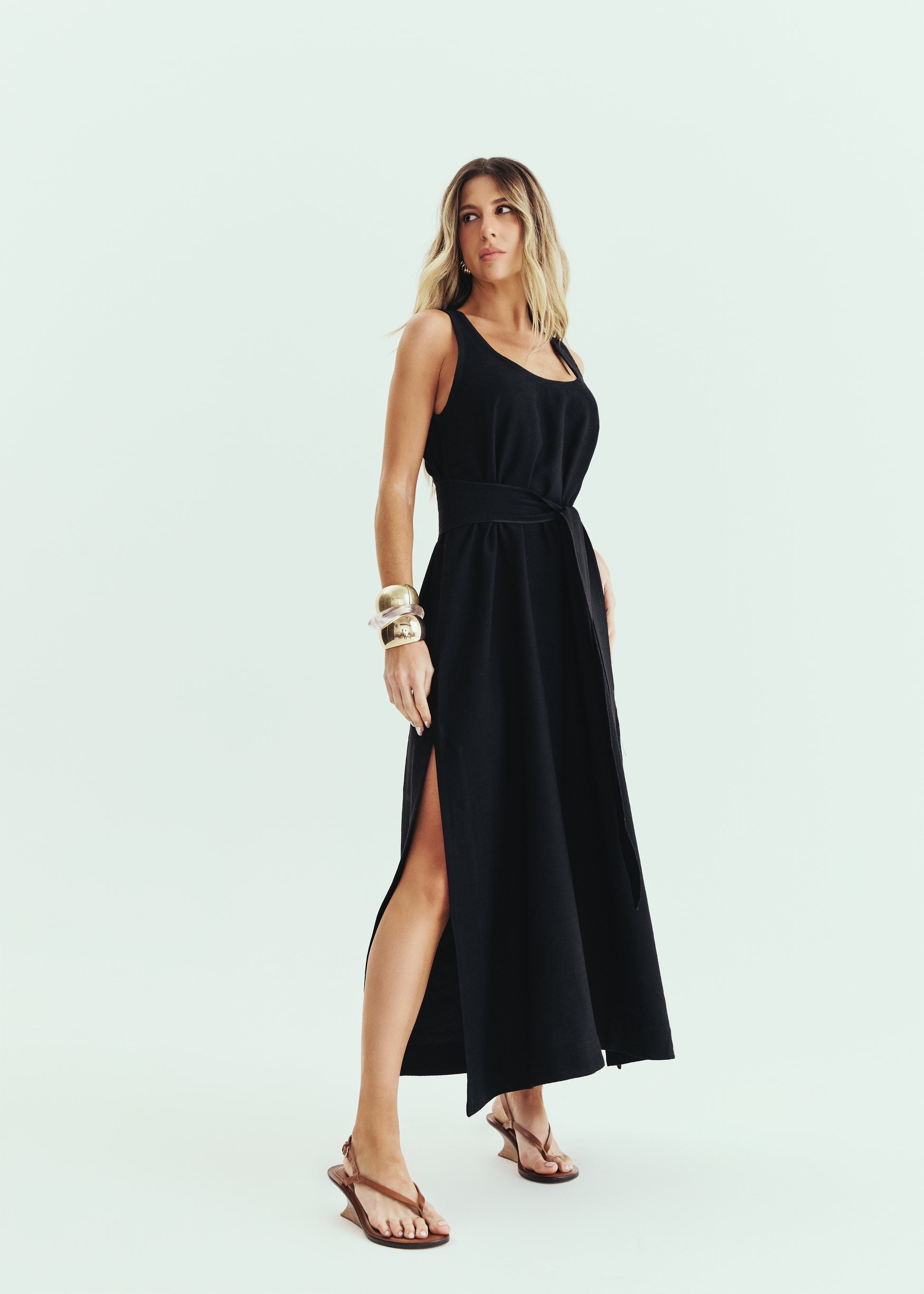 Vestido longuete com fenda lateral e faixa confeccionado em alfaiataria.