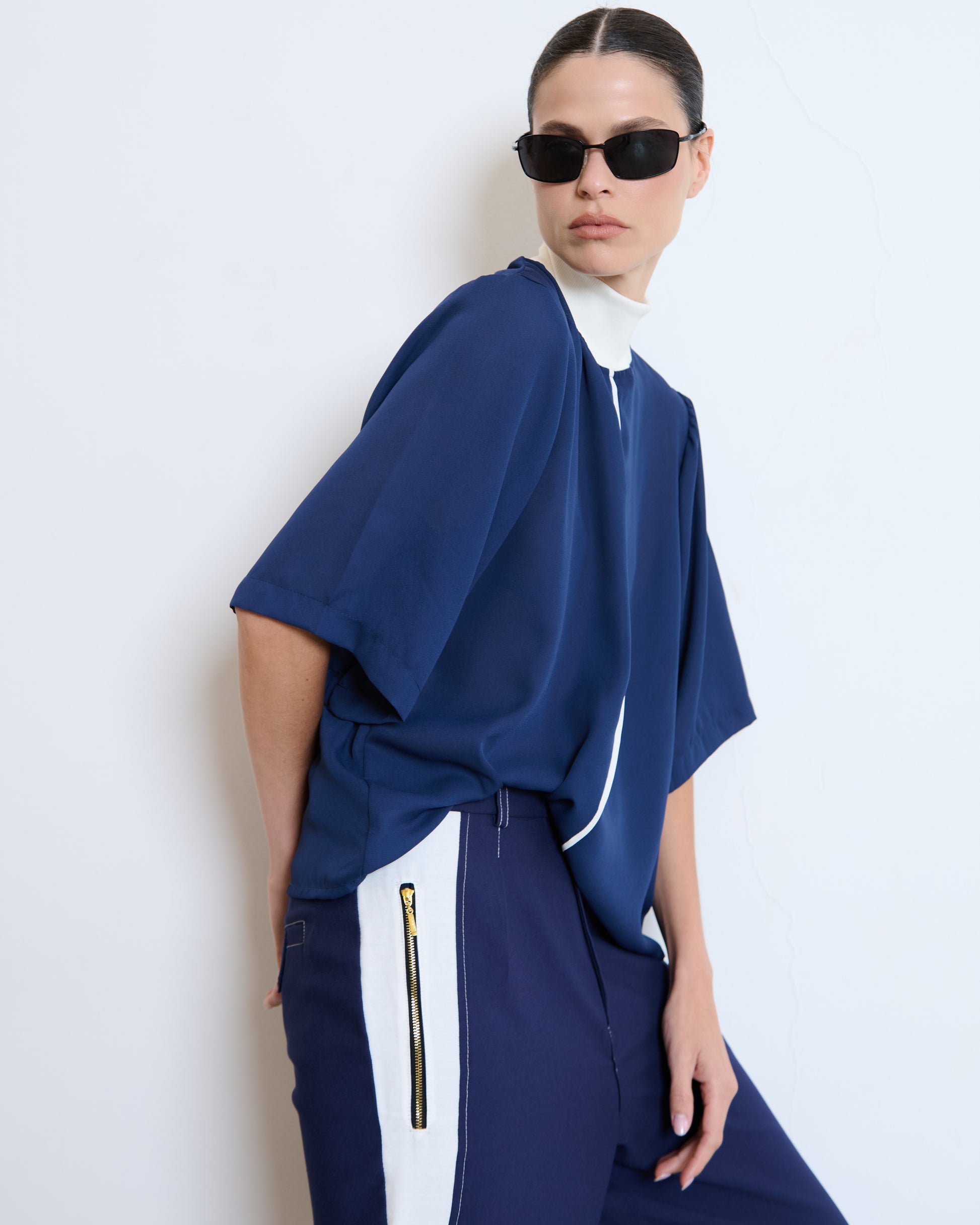 Blusa gola alta com design moderno e minimalista, em tom azul, que combina conforto e sofisticação. Modelagem ampla e solta, com caimento fluido e mangas curtas largas, garantindo leveza e movimento.