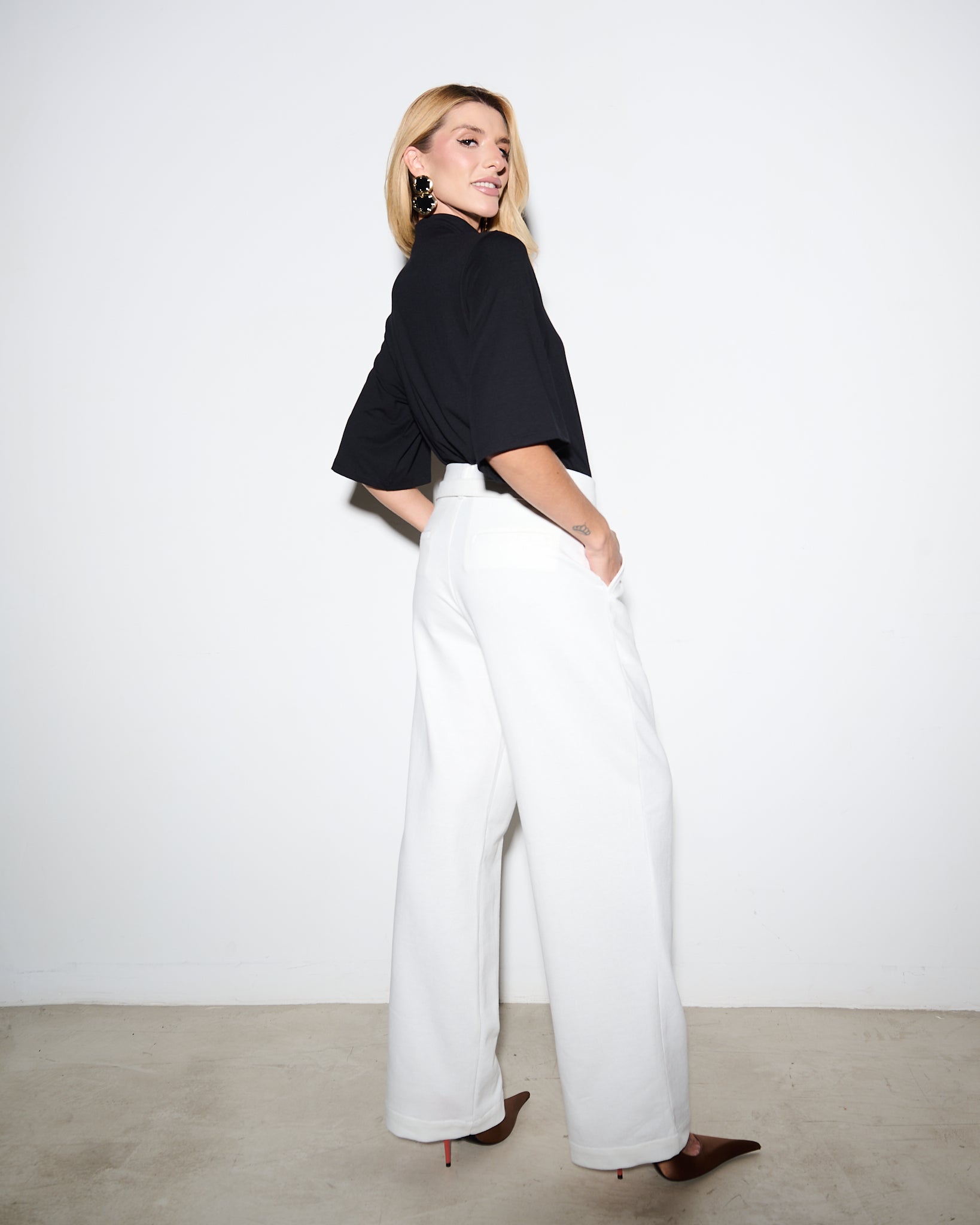 Calça cintura alta com pregas na frente, possui bolsos e acompanha cinto.