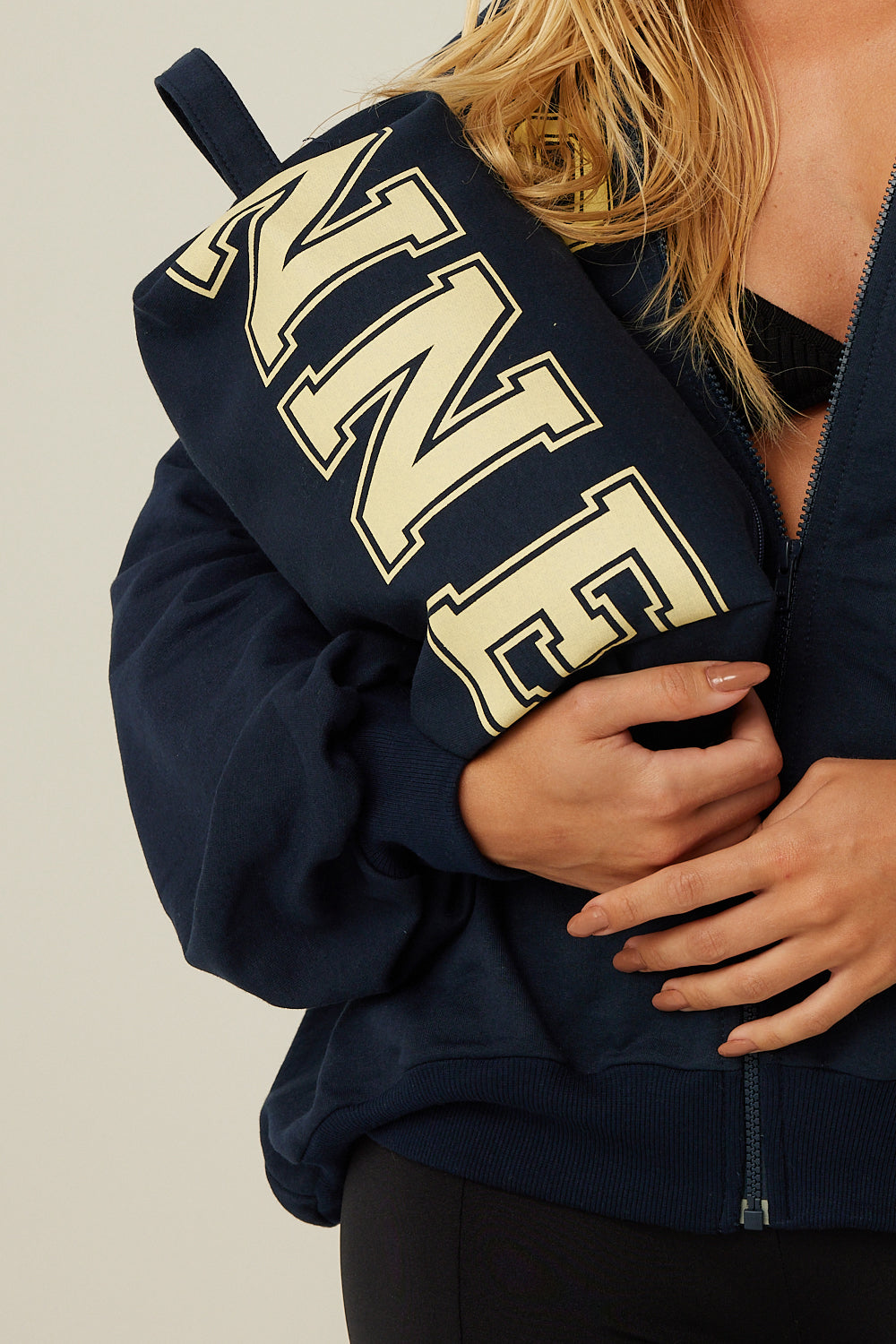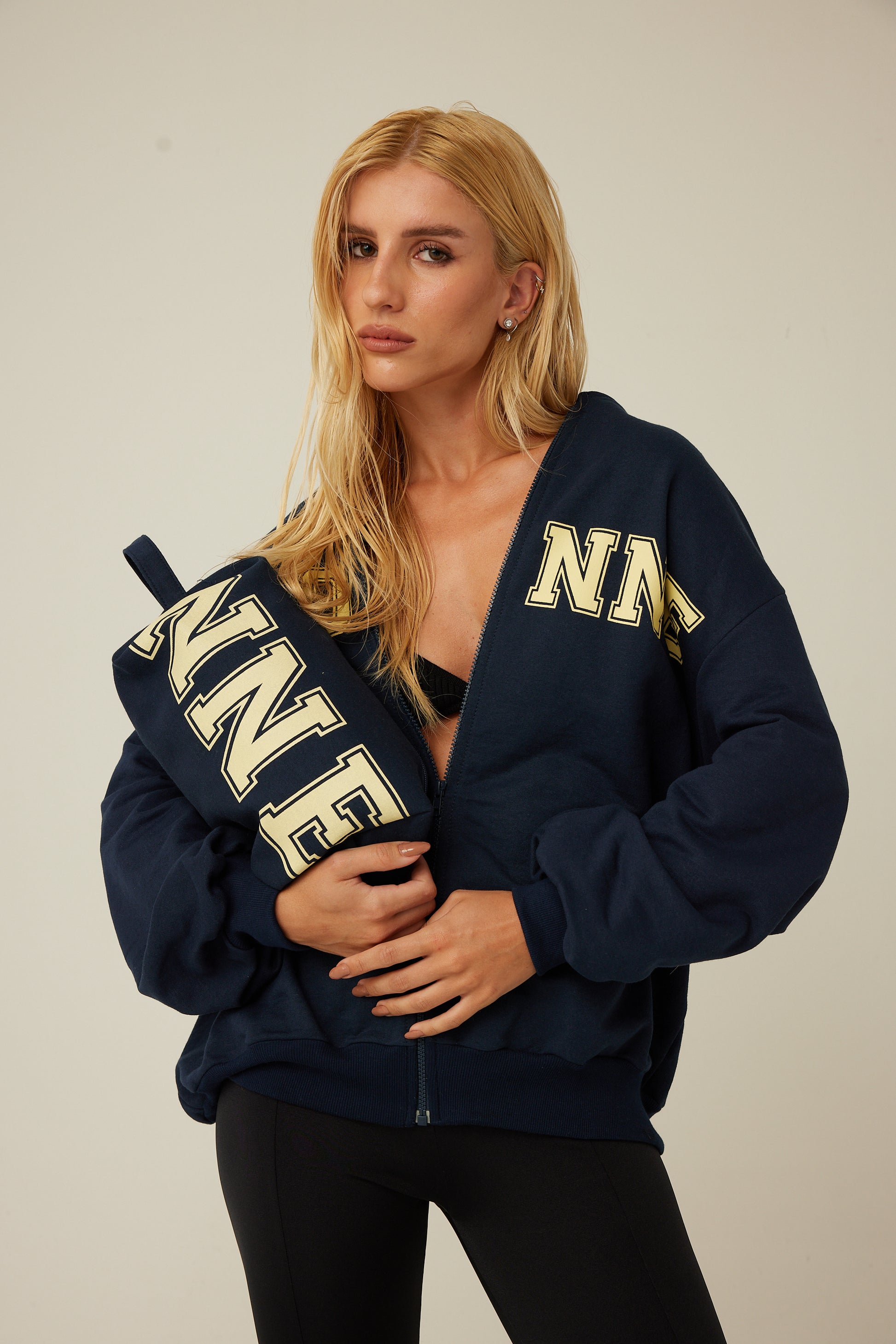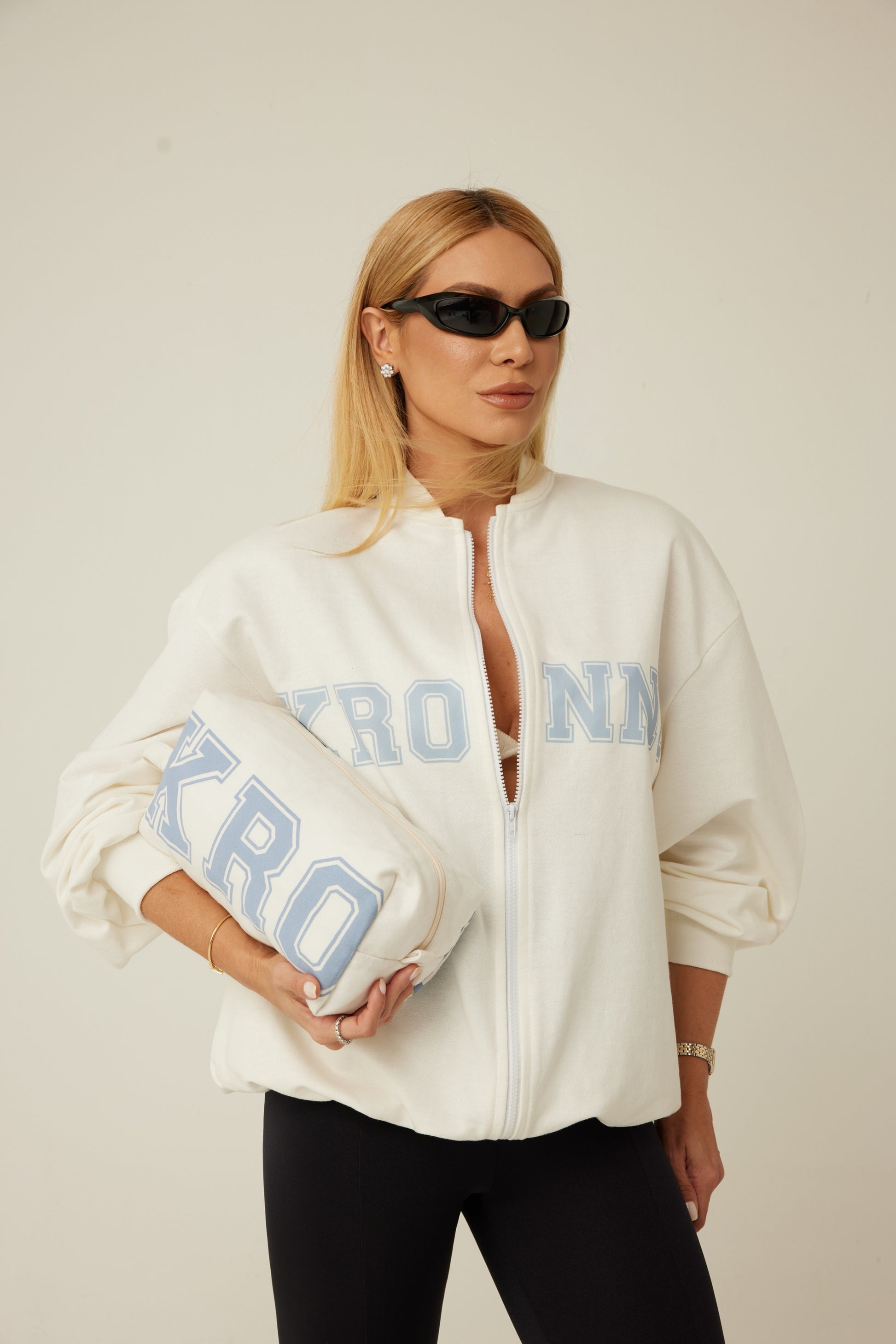 Jaqueta college com modelagem mais ampla, possui detalhe de ribana canelada na gola, punhos e barra. Acompanha nécessaire tamanho grande, possui um zíper e silk com a logo Kronne.