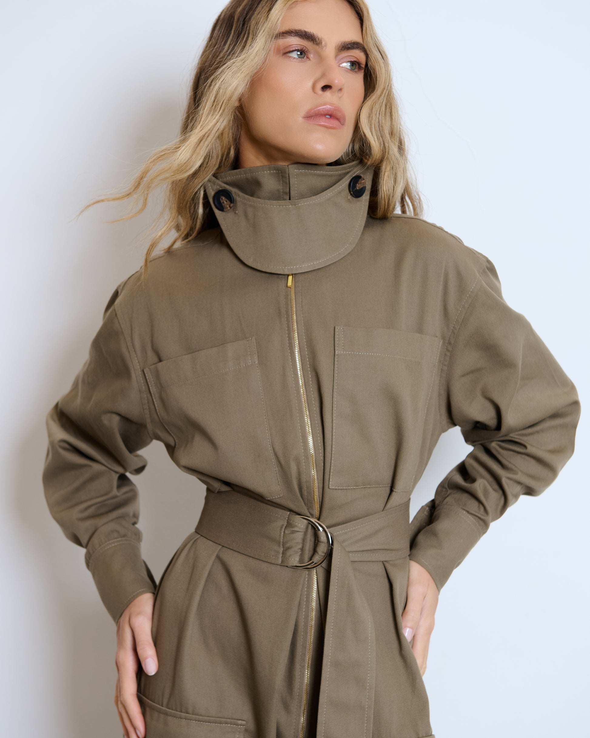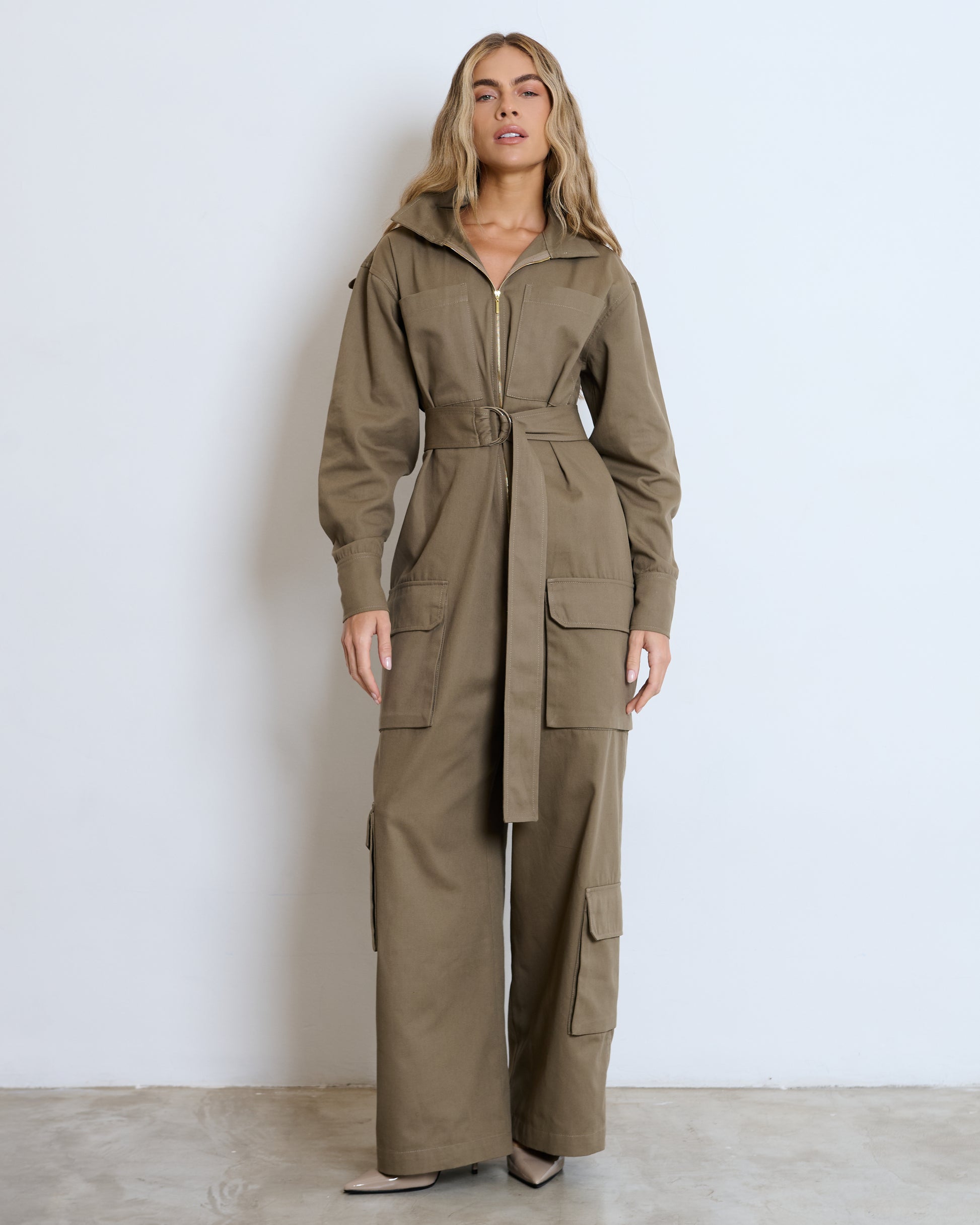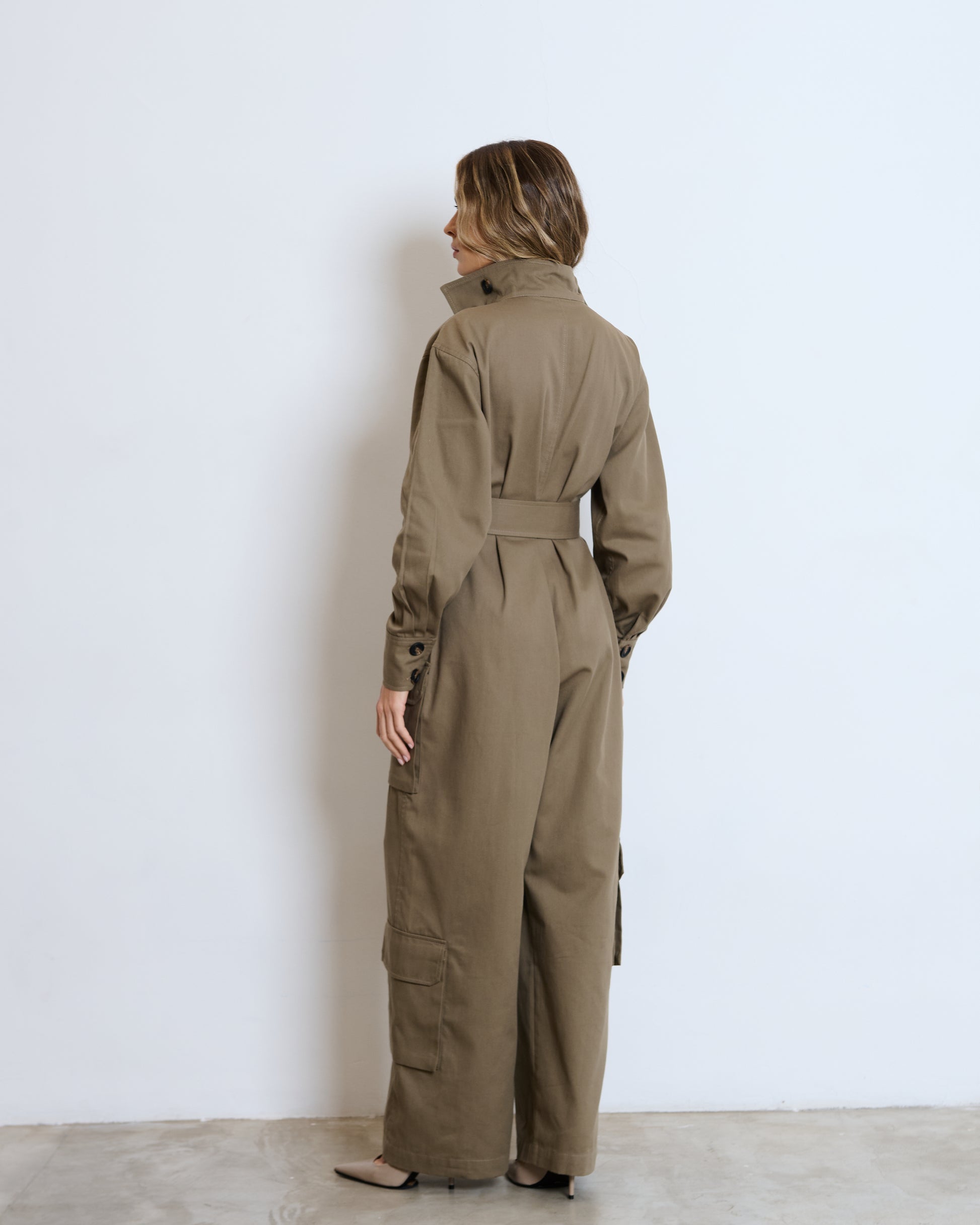 Macacão com influência utilitária, em caqui, que une funcionalidade e sofisticação em uma proposta contemporânea.